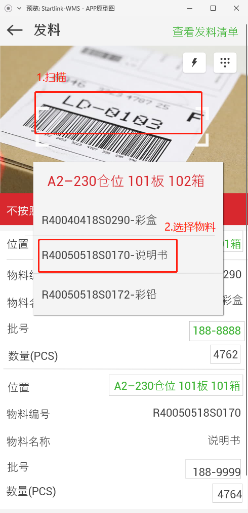 1.1.扫描位置标签,扫描框提示“不按推荐位置、批号发料”(显示为红色);