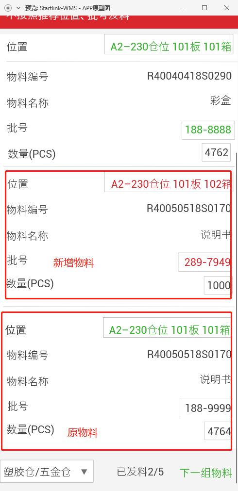 014- 3.批号、位置都为红色时,视为该物料已发,本组已发物料加一;