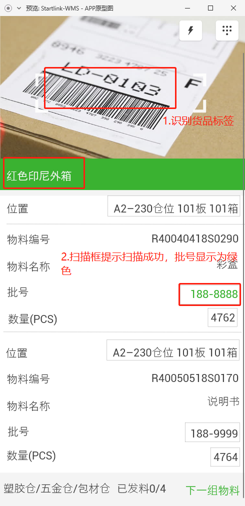 2.1.扫描货品标签,扫描框提示扫描成功(提示物料名称,显示为绿色),批号显示为绿色;