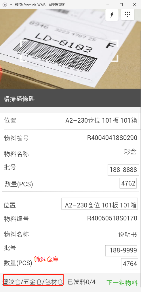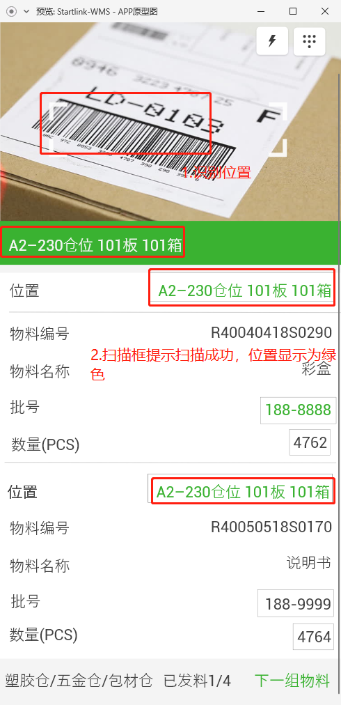2.3.批号、位置都为绿色时,视为该物料已发,本组已发物料加一;