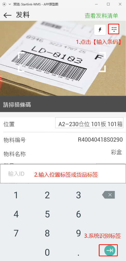 1.【发料】页面显示推荐物料的位置、批号、物料编号、物料名称、数量;