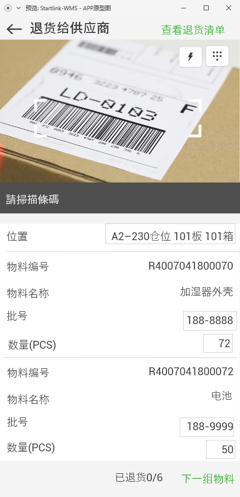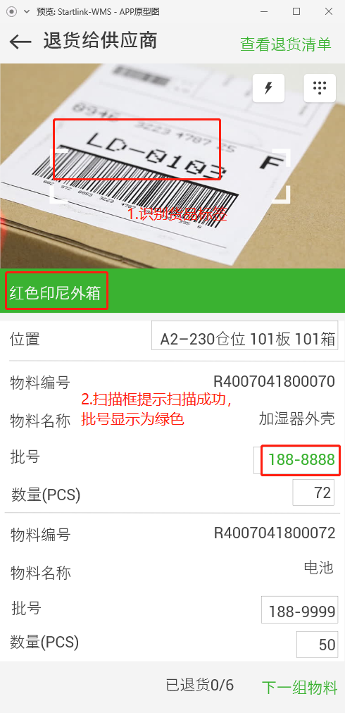 2.1.扫描货品标签,扫描框提示扫描成功(提示物料名称,显示为绿色),批号显示为绿色;