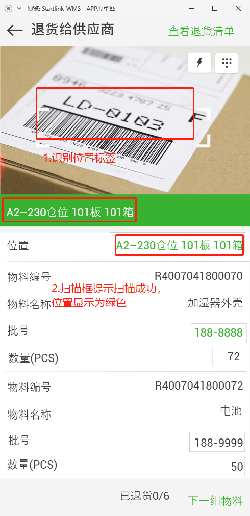 2.3.批号、位置都为绿色时,视为该物料已扫描,本组已扫描料加一;