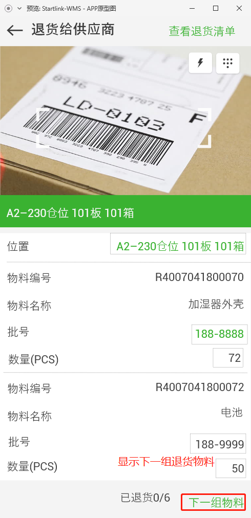 1.【退货】页面显示物料的位置、批号、物料编号、物料名称、数量;