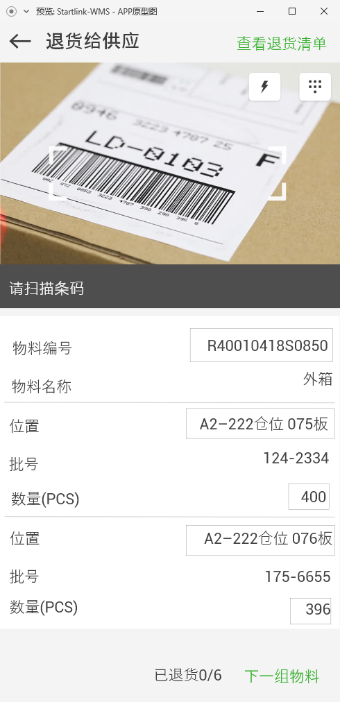 1.【退货】页面显示物料的位置、批号、物料编号、物料名称、数量;