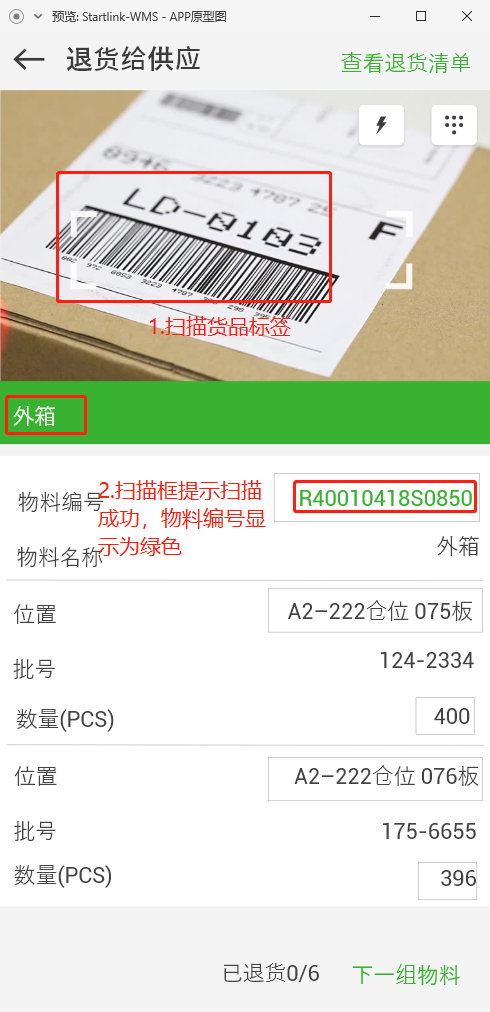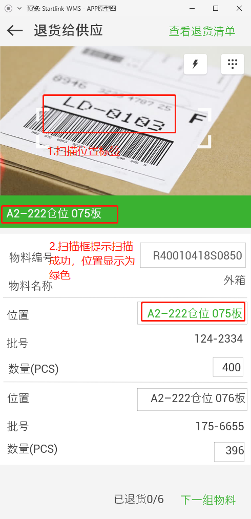 2.3.批号、位置都为绿色时,视为该物料已扫描,本组已扫描料加一;