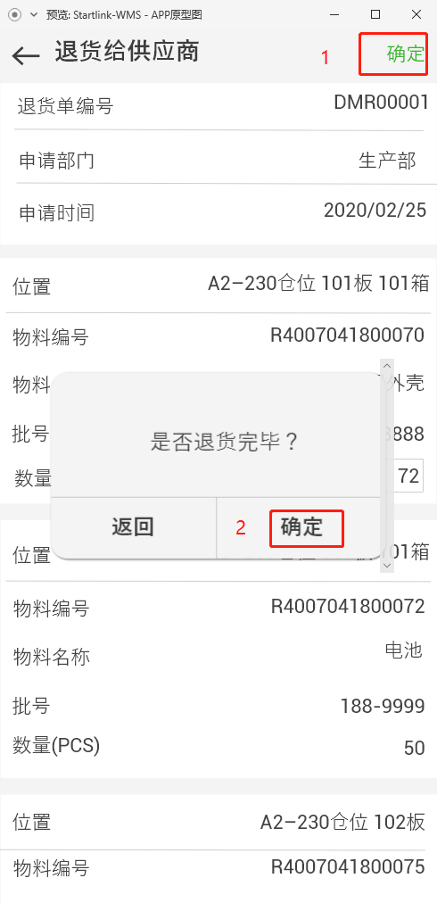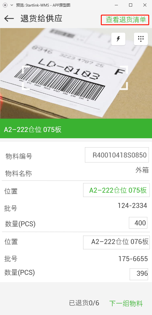 1.2.退货清单表体:位置、物料编号、物料名称、批号、数量(PCS)(少发物料显示为:30(少发20),表示推荐物料50个,实发30个;物料显示规则参考故事【退货-扫码退货】);