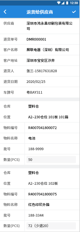 1.2.退货清单表体:位置、物料编号、物料名称、批号、数量(PCS)(少发物料显示为:30(少退20),表示物料50个,实退30个;物料显示规则参考故事【退货-扫码退货】);