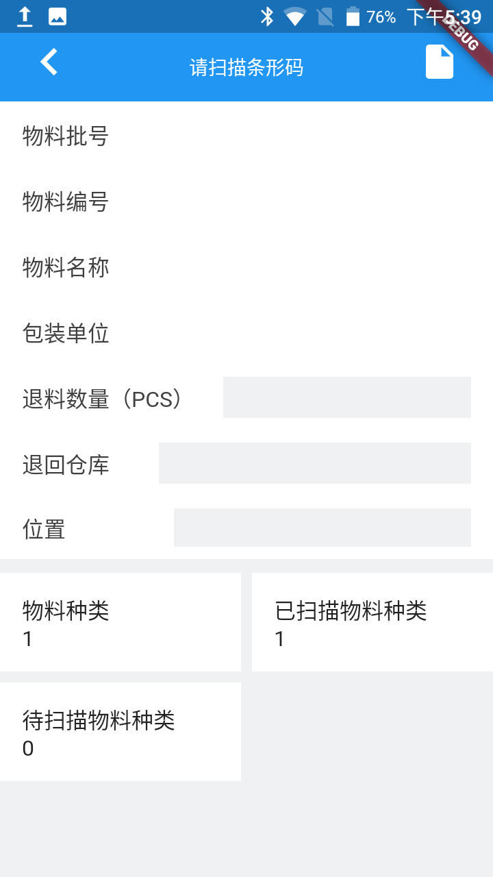 | 物料信息 | 展示 | 文本: 物料编号 物料名称 包装单位 退料数量,输入框 退回仓库,选择框 位置 物料种类 已扫描物料种类 待扫描物料种类 |