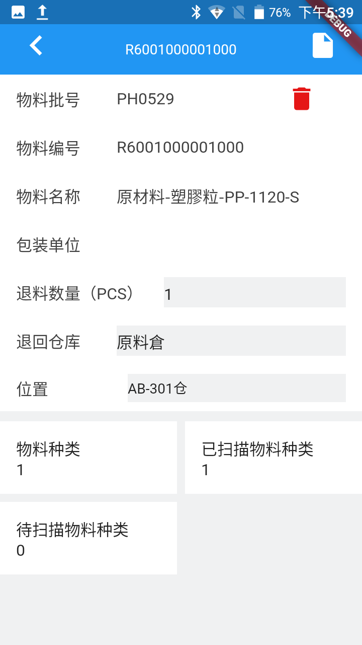 1.扫描成功,自动填充信息:物料批号,物料编号,物料名称,包装单位,退料数量 已扫描和待扫描物料种类数量更新,已扫描物料种类加个数,待扫描物料种类减个数 2.退料数量,输入框,可以编辑退货数量 4.点击图标,删除物料,返回已扫描送货单二维码页面 并且已扫描物料种类数量更新,已扫描物料种类减个数,待扫描物料种类加个数 |