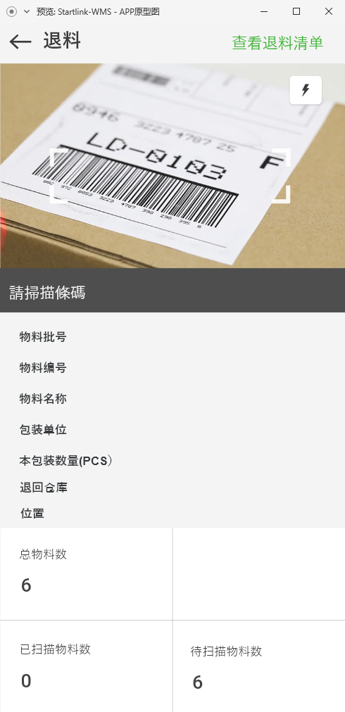 1.【退料】页面默认开启【扫描条码】功能,显示总包装数、已扫描包装数、待扫描包装数;