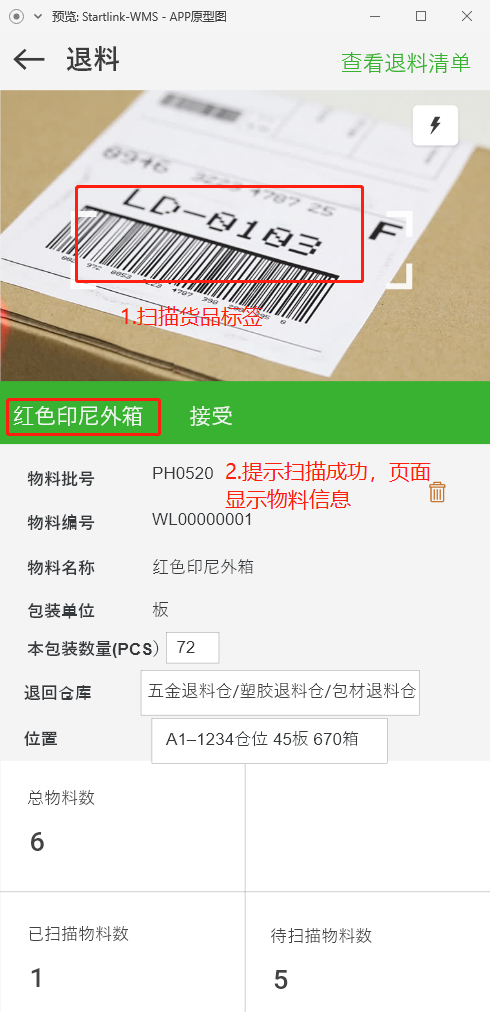 2.1.扫描货品标签,扫描框提示扫描成功(提示物料名称,如:“红色印尼外箱”,显示为绿色);