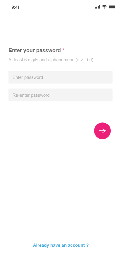 操作提示,例:“Enter your password *”、 填写说明,例:“At least 6 digits and alphanumeric (a-z, 0-9)” 密码输入框,默认为空时显示“Enter password” |