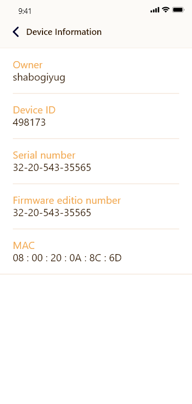 所有者(用户昵称)、 设备ID、 设备序列号、 固件编号、 MAC物理地址 |